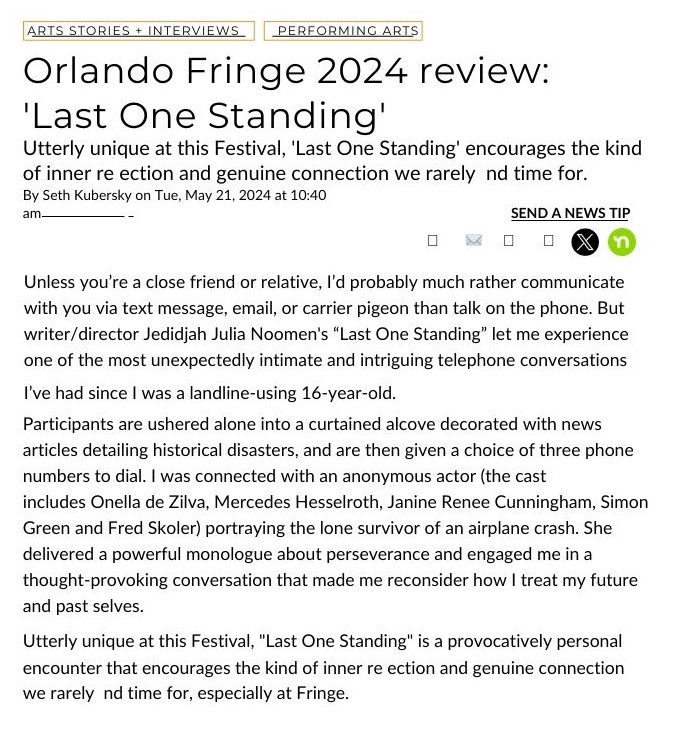 This immersive experience had its first shows at the Cannonball Festival during Philadelphia Fringe in September 2023. It was selected for the Cannonball ‘Snack Track‘, which supports designers of experimental and innovative small interactive experiences. ‘Last One Standing’ will tour North America during 2024 – more info and dates on the Hummingbird Interactive website.